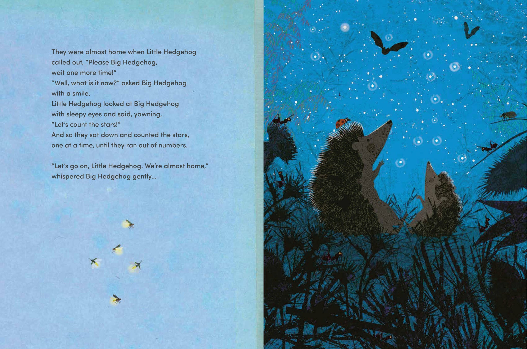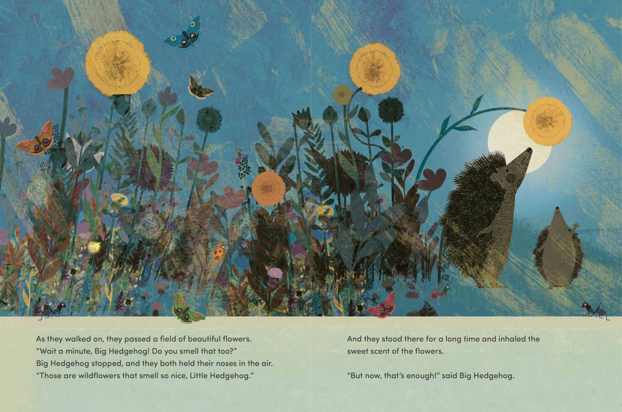It is evening and the big and little hedgehog are slowly making their way home. There is so much to see, and the little one wants to take it all in.