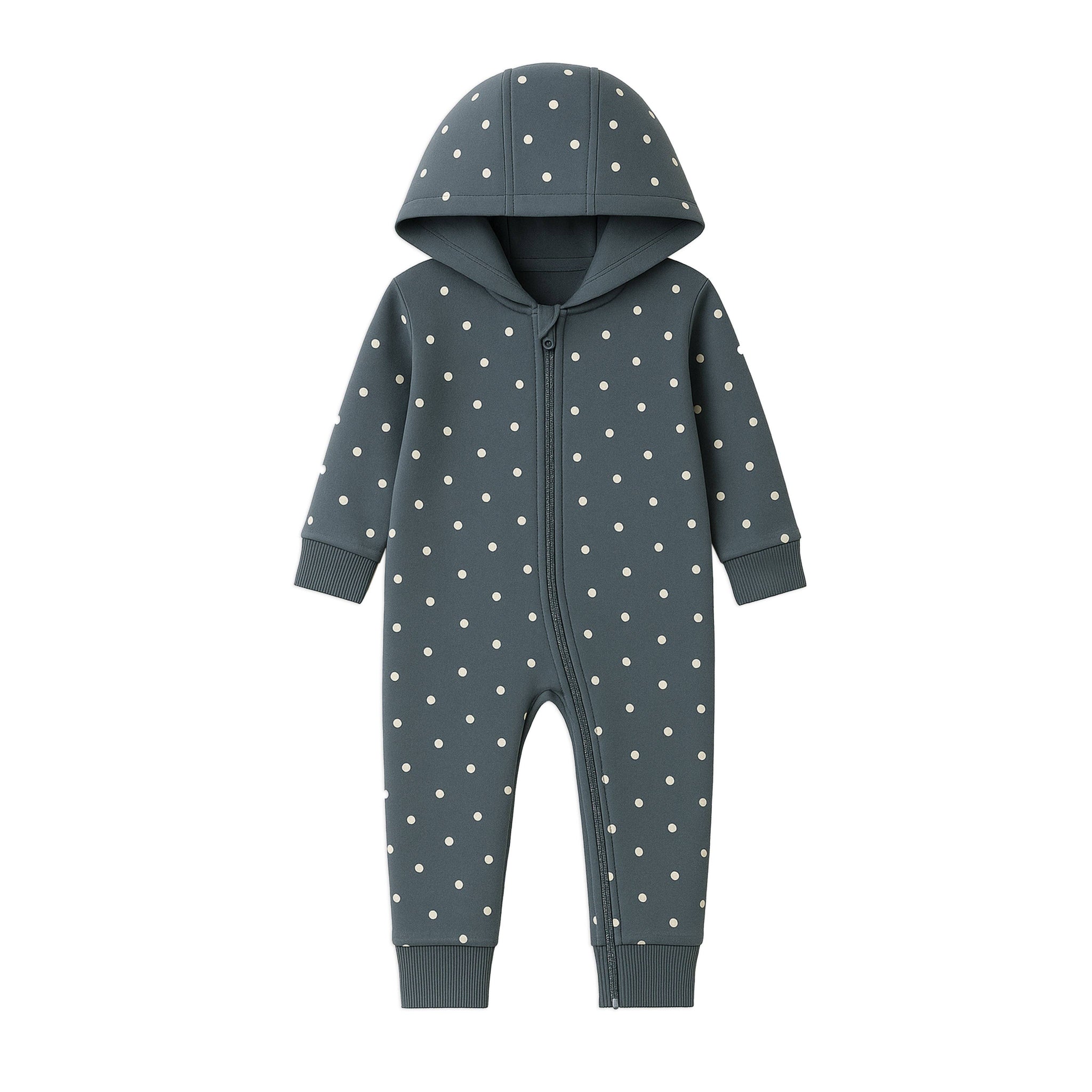 Product images shown are digital renderings. Final colors, textures, or details may vary slightly. This comfy-cozy romper is a cooler temp must-have! Bonus details add to the coziness with its hood and back pocket design. Mindfully made with a front-opening two-way guarded zipper, ribbed cuffs, soft elastic leg openings, and crotch gusset for easy, hassle-free changes. * Made of 100% organic cotton fabric * Rib with elastane sleeve and leg cuffs * Nickel-free snaps * Water-based dyes ensuring long-lasting color