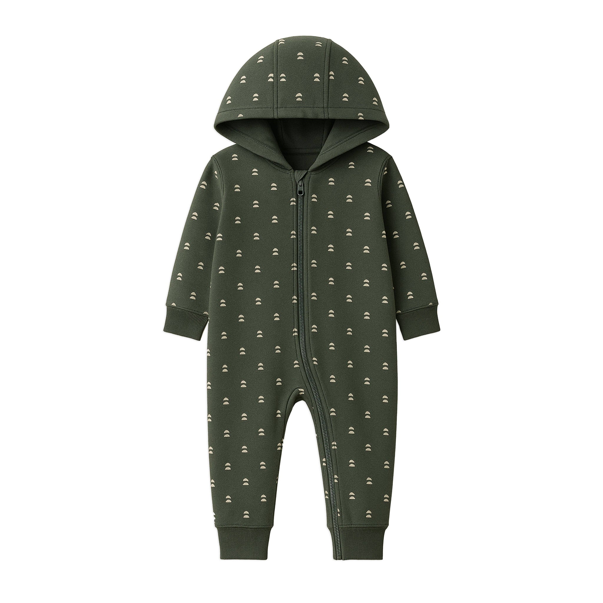 Greer Fleece Hooded Zipper Romper: Bent / Pine / 3-6M