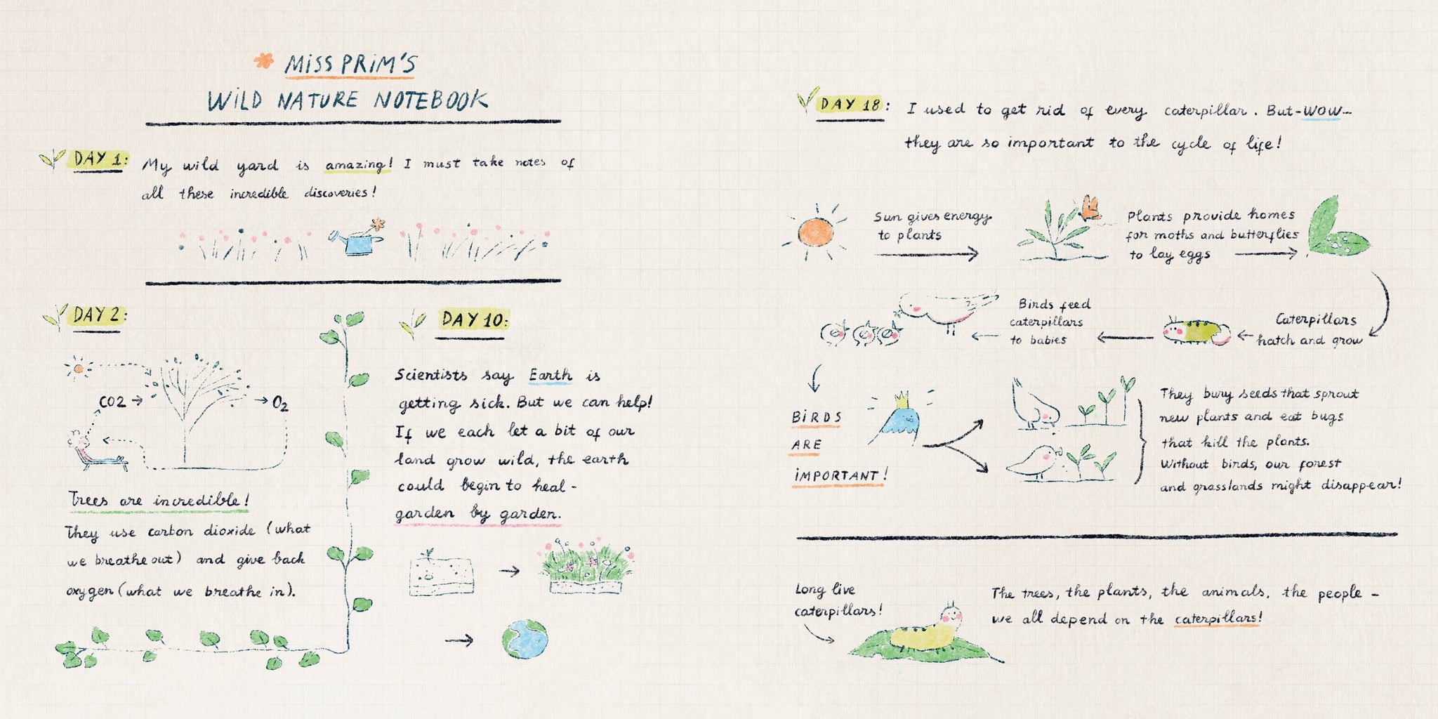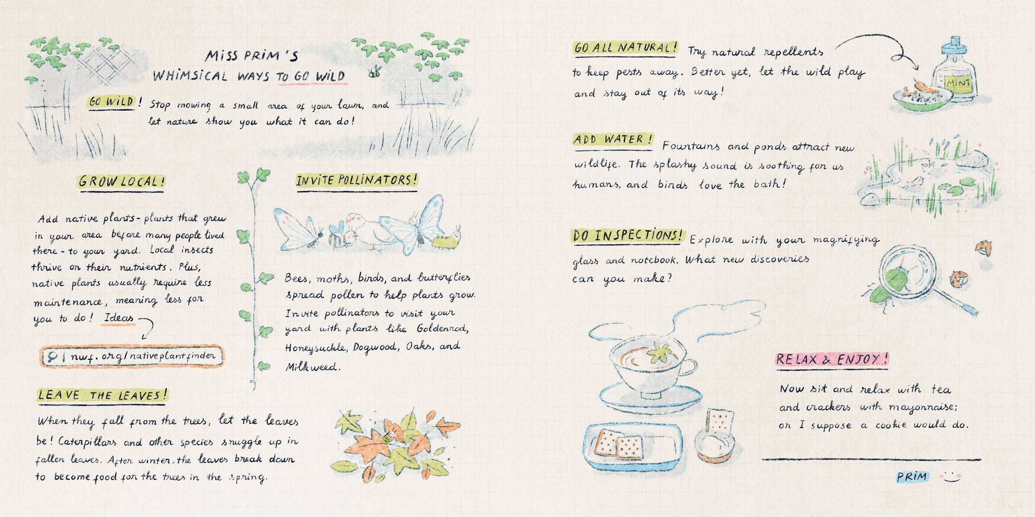 With alliterations that roll off the tongue, whimsical illustrations, and timeless messages, Miss Prim Goes Wild is perfect for under a shady tree. Miss Prim’s change flows into her journal in the back of the book, where she studiously takes notes about the wild ways of nature that she’s come to love, and teaches children how to watch the wild grow in their own back yards.