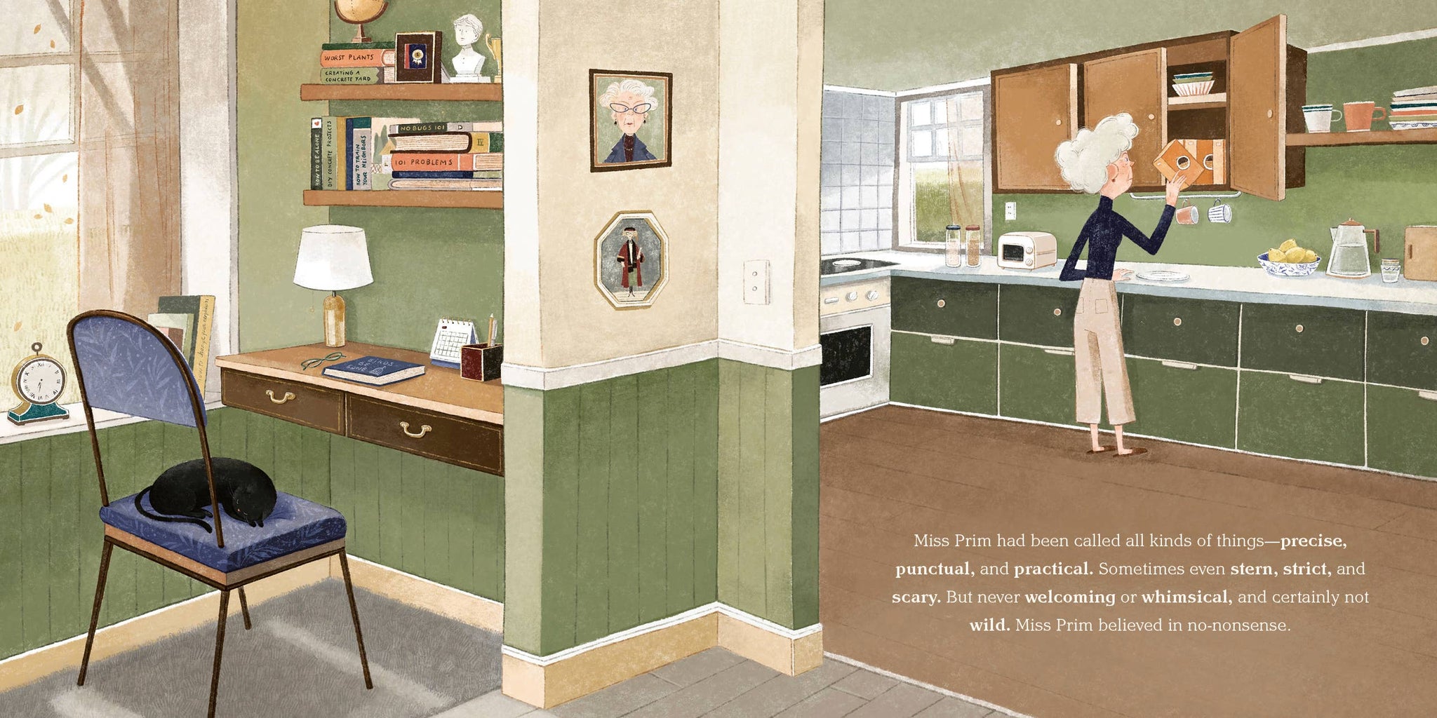 Miss Prim had been called all kinds of things—precise, punctual, and practical. Sometimes even stern, strict, and scary. But never welcoming or whimsical, and certainly not wild. Miss Prim believed in no-nonsense.